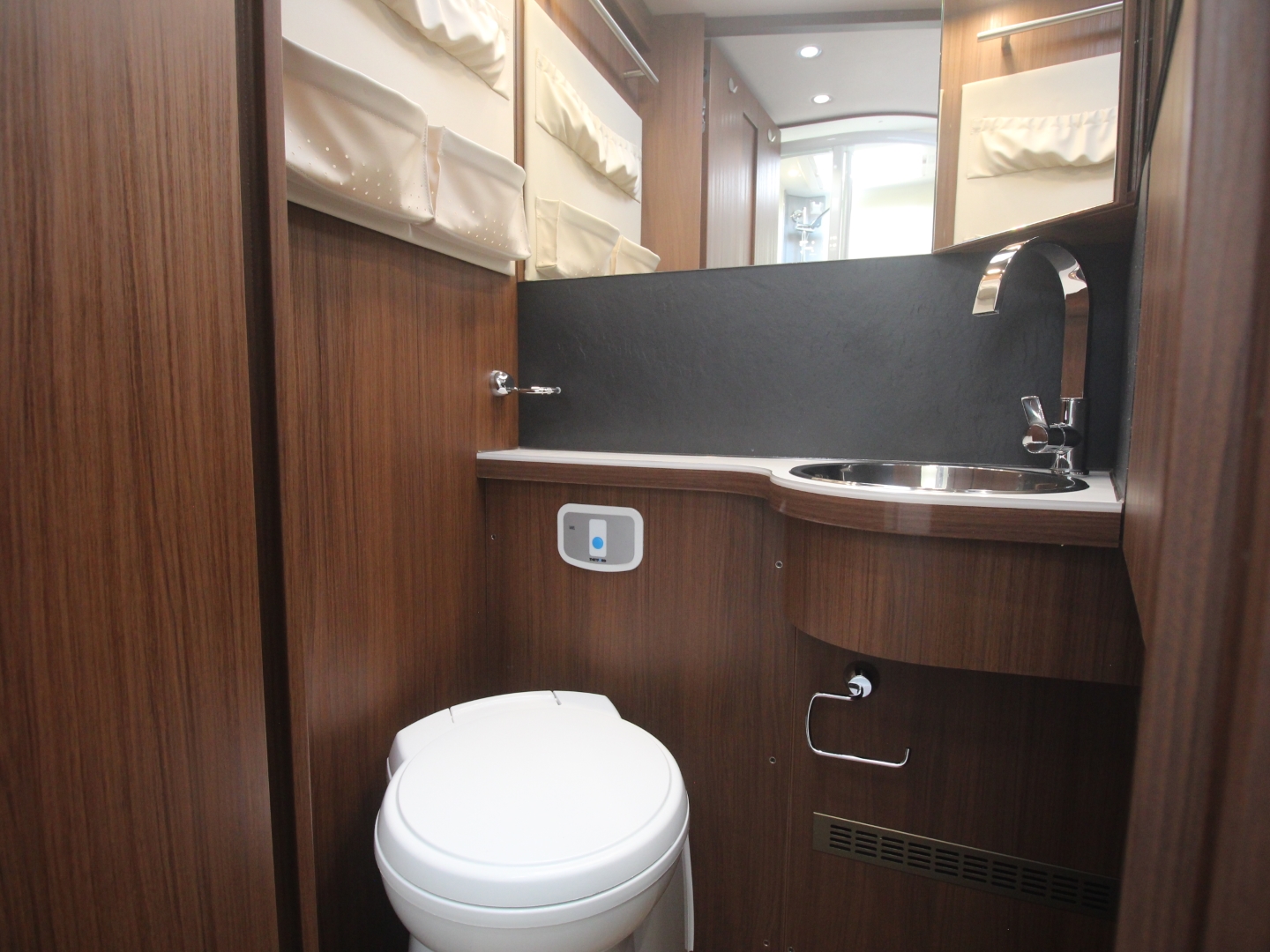 Links achterin bevind zich de bijzonder ruime douchecabine, en er tegenover de ruime badkamer met Thetford toilet, met SOG automatische toilet ontluchting en veel extra kastruimte. Het geheel is afsluitbaar dmv. een deur, waardoor er een heel royale ruimte onstaat met alle privacy.