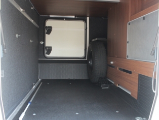 De camper heeft veel bergruimte in de dubbele bodem bereikbaar dmv. verschillende luiken in de vloer. Het bevat tevens een grote garage, met aan beide zijden een deur, waarin uw bagage en fietsen veilig binnen geplaatst kunnen worden. Garagedeuren en camperdeur worden met afstandsbediening automatisch vergrendeld.