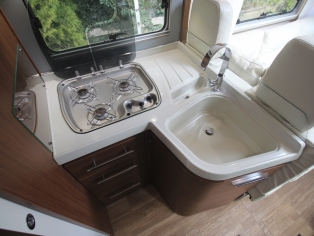 De royale hoekkeuken heeft een luxe keukenblad met spoelbak en 3 pits kooktoestel met automatische ontsteking, diverse gelagerde laden met servo softsluiting, en verrassend veel bergruimte voor het kookgerei en boodschappen, grote dubbeldeurs Dometic koelkast 160 ltr met aparte vriezer en automatische omschakeling van 220 V/12 V/gas en een luxe gasoven. Boven de keuken bevind zich een elektrische ventilator.