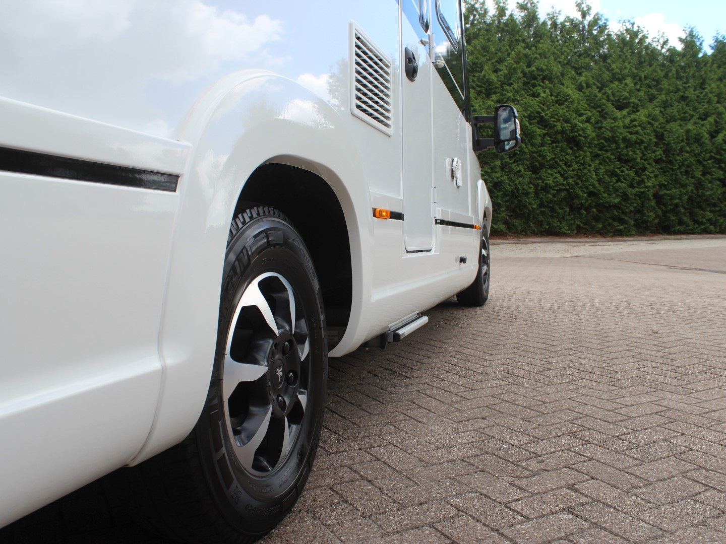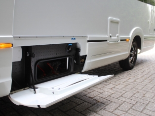 De comfort ingangsdeur is voorzien van een raam, schuifbare hordeur en een elektrisch geïntegreerde opstap.