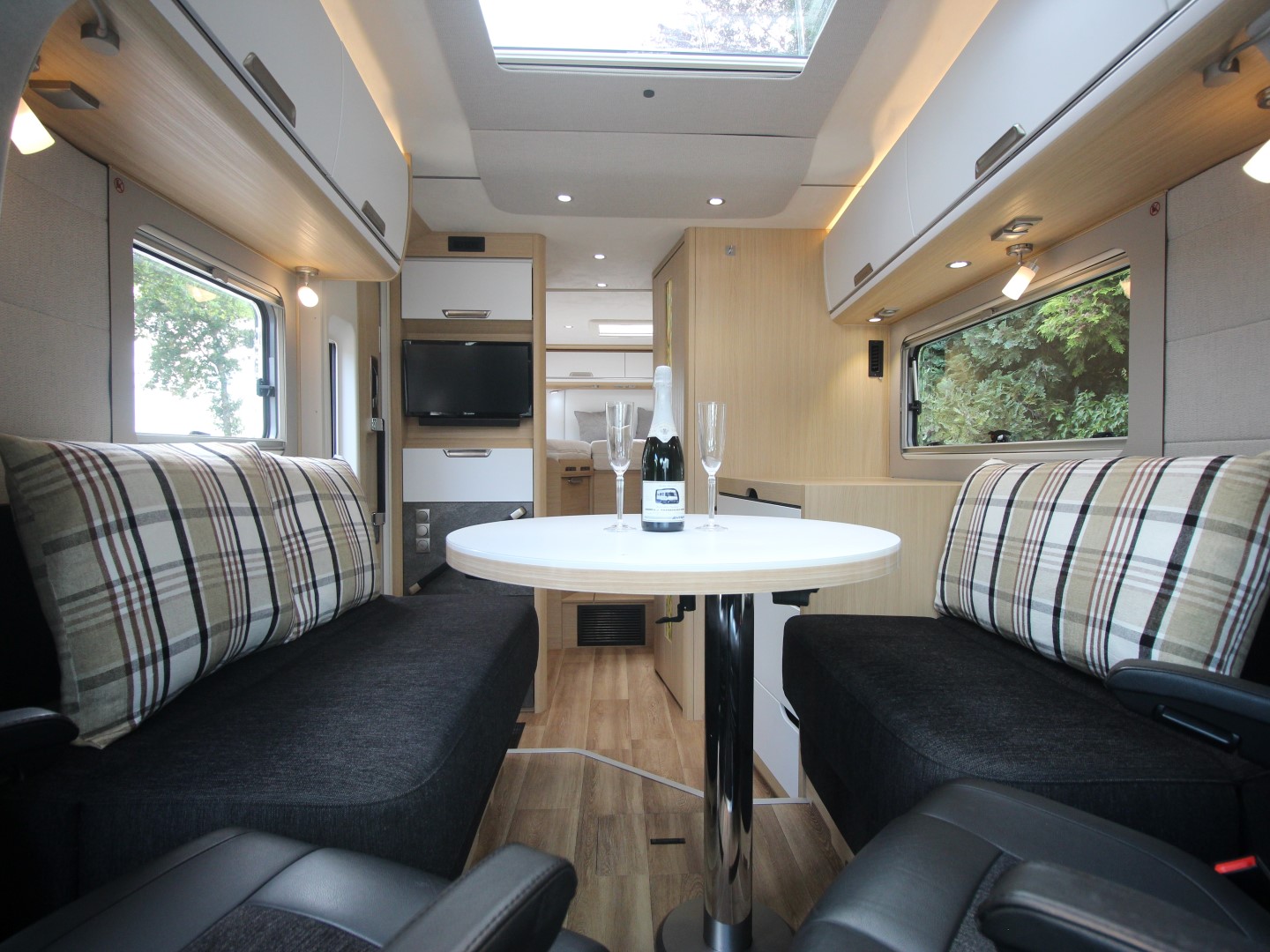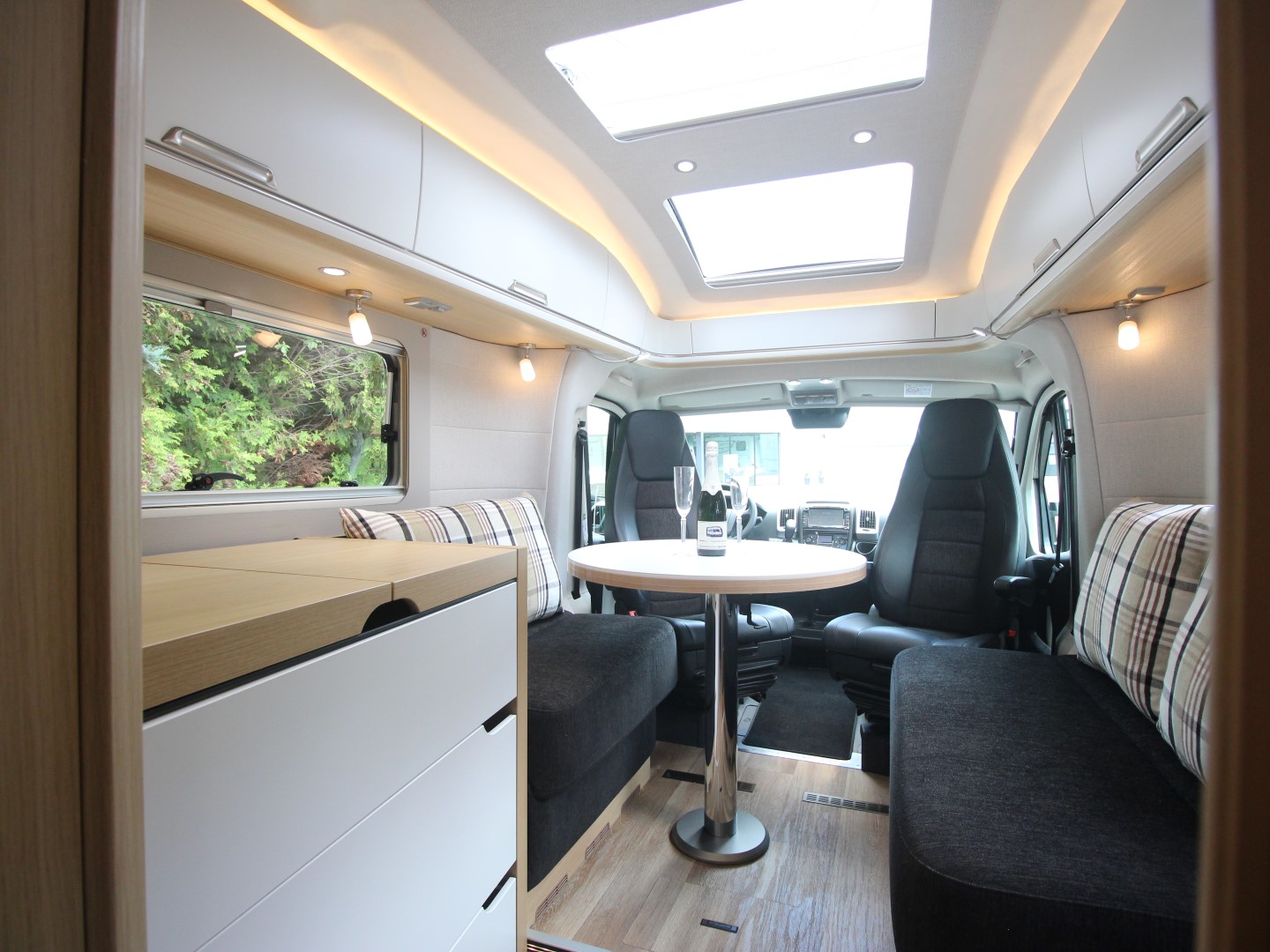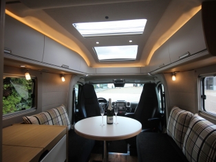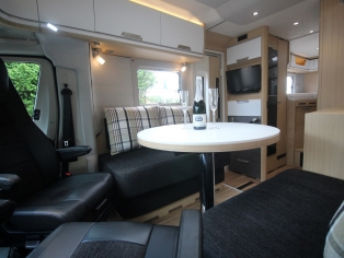 Twee SKA comfort cabinestoelen incl. stoelverwarming, in hoogte verstelbaar en kantelbaar, draaibaar naar een gezellige en ruime zitgroep met een electrisch bedienbaar panoramadak erboven. Het interieur bestaat uit stijlvol meubilair in combinatie met de luxe textielcombinatie Shadow waarbij met de vele LED verlichting een bijzondere sfeer ontstaat. Alle ramen zijn voorzien van vouwverduistering.
