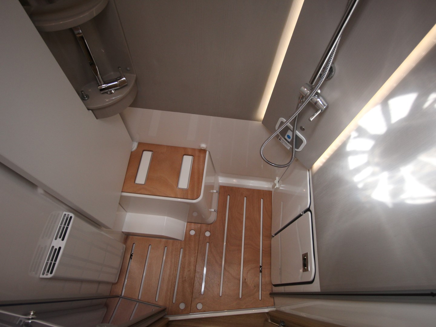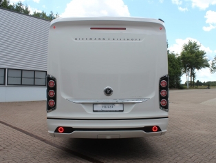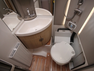 De ruime badkamer bevat ingenieus 'Vario-badkamerconcept' met draaibaar toilet en wastafel, waarbij een bijzonder ruime douchecabine ontstaat.De 140 ltr schoon - en 130 ltr vuilwatertank bevinden zich in de (verwarmde) dubbele vloer. Voor uw bagage is er ruimschoots ruimte in de grote garage, bereikbaar dmv. een toegangsdeur links en rechts.