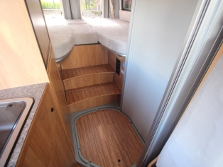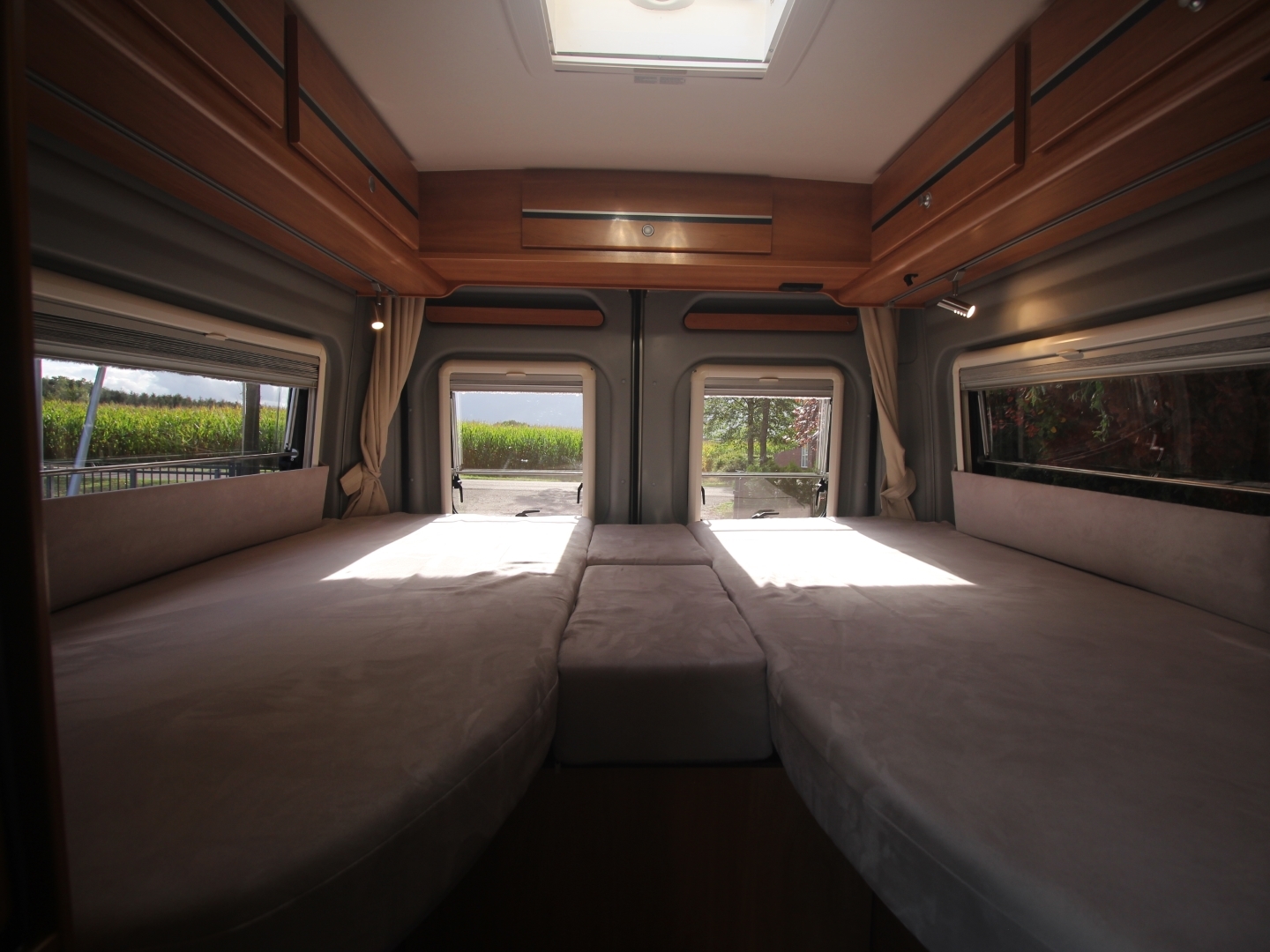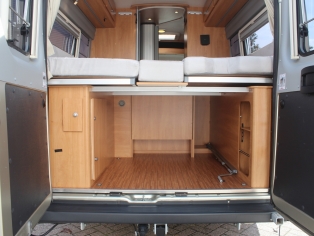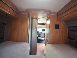 Het slaapgedeelte heeft 2 royale aparte bedden met binnenveringsmatras op lattenbodem, waaronder zich meerdere bergruimtes bevinden.