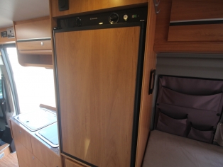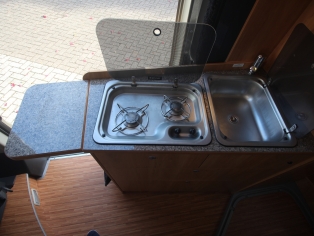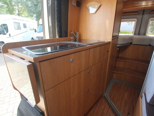 De keuken bevat een spoelbak en 2 pits kooktoestel, diverse gelagerde laden met verrassend veel bergruimte voor het kookgerei en boodschappen, en een hooggeplaatste Dometic koelkast met vriesvak.