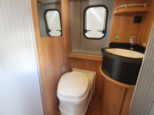 Door de schuifwand te draaien ontstaat een ruime badkamer met wastafel en een Thetford toilet, en een aparte grote douchecabine.